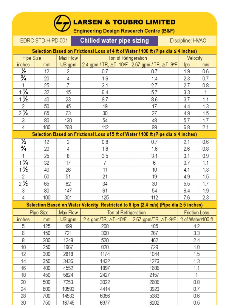 Appendixe sizing of water piping system. In north america, nominal pipe size (nps) is the standard for identifying pipe sizes. For example, a 1 inch pvc pipe is actually 1.315 inches in outside diameter, and 1.029 inches in inside diameter. 3' frictional pressure drop per 100' pipe length with a maximum velocity of 10 ft/sec. The following chart gives standard pipe schedule or pipes sizes as given by ansi / asme b36.10m and api 5l.